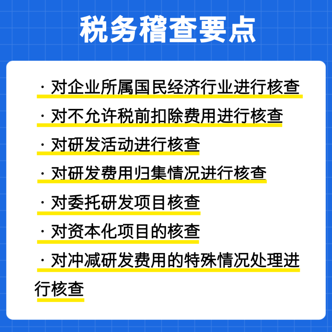 抽查鑒定:稅局一般于第四季度組織專家,針對享受加計扣除稅收優惠企業進行抽查,核查內容主要包括:研發費用歸集是否符合政策要求、費用支出憑證(發票)、費用構成是否合理、是否有研發費用輔助帳、是否有成果支撐,此類抽查存在項目被專家否定導致企業補稅的風險。